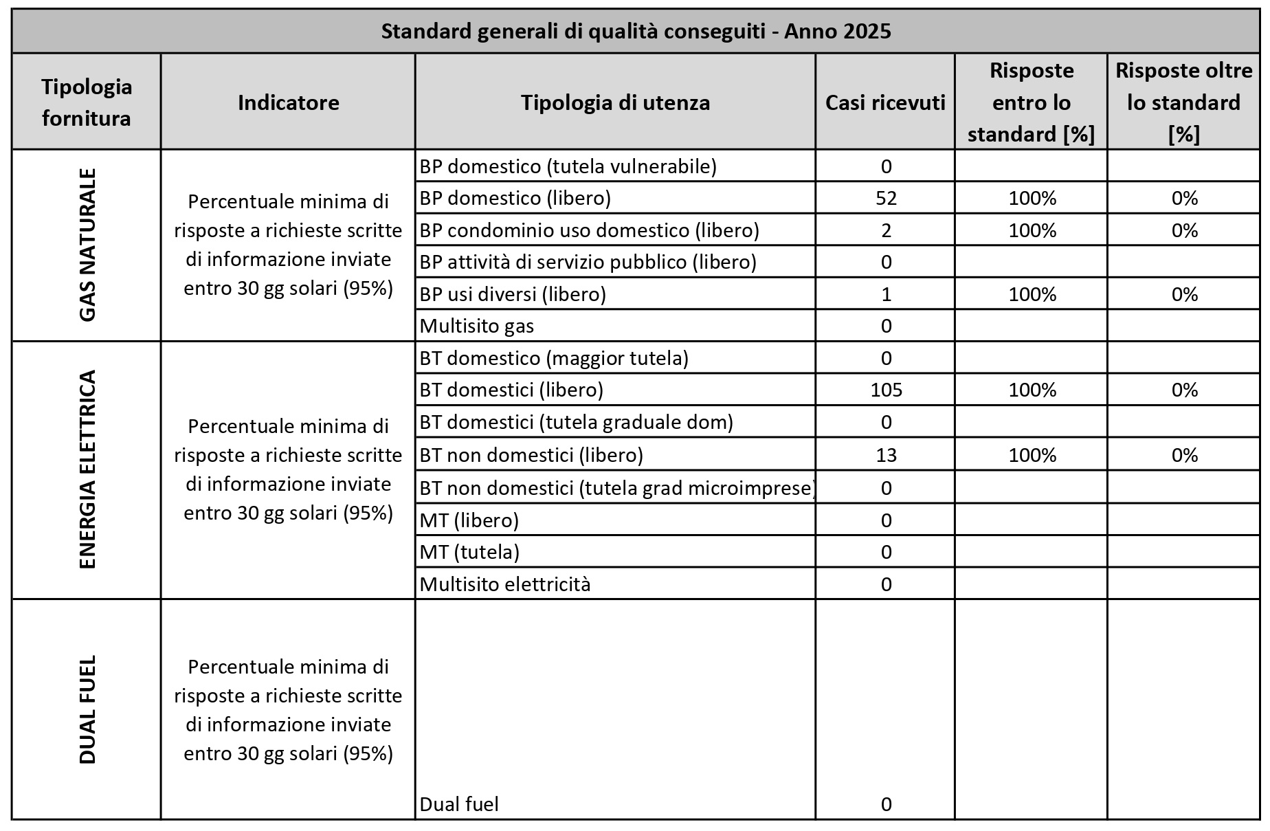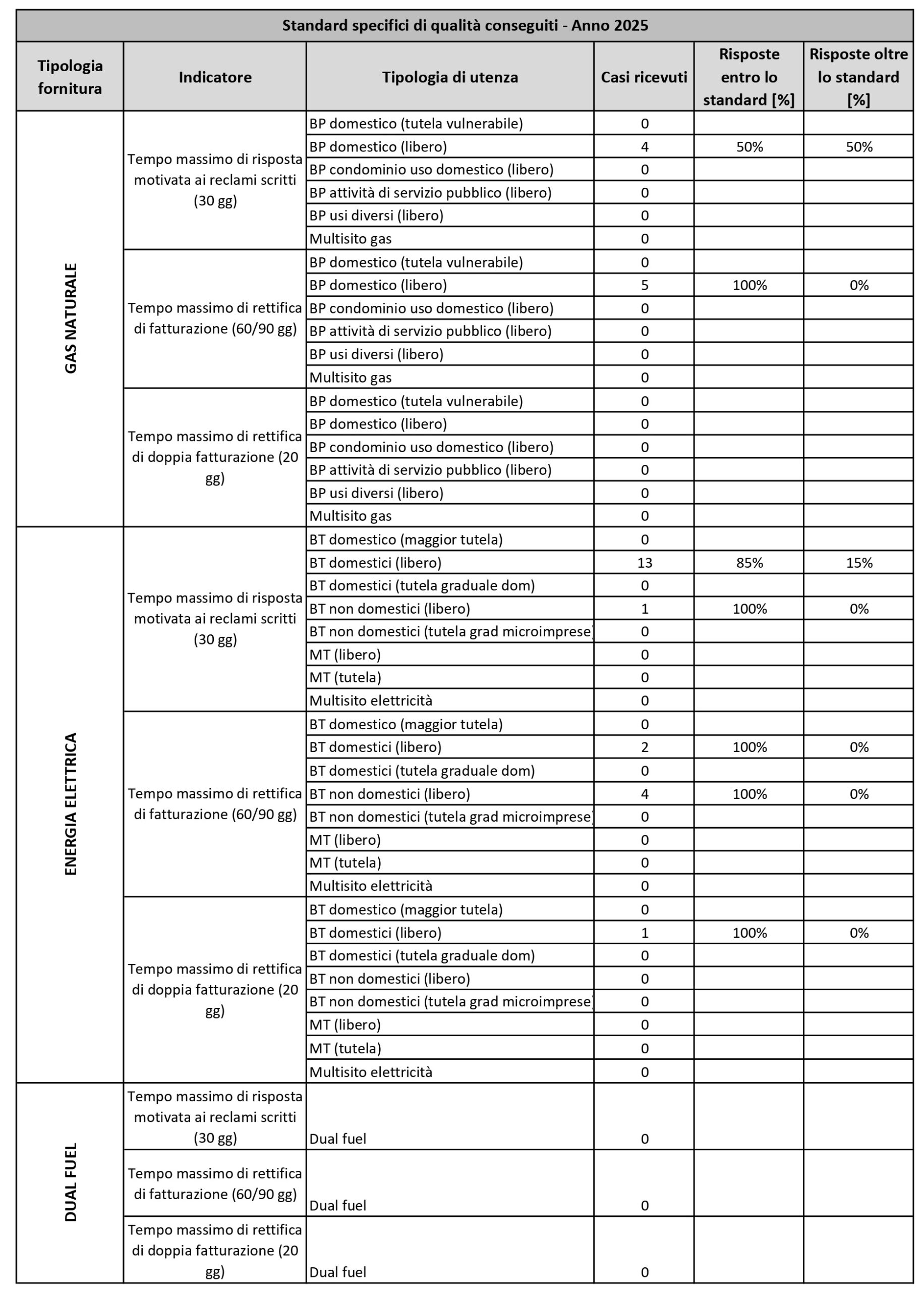 Ai sensi dell’art. 37.1, allegato A della delibera n. 399/2025/R/com dell’Autorità di Regolazione per Energia, Reti e Ambiente (ARERA), che stabilisce i livelli minimi di servizio (standard di qualità) che le aziende di vendita di energia elettrica e gas naturale devono garantire ai propri clienti alimentati in bassa tensione (EE) e in bassa pressione con consumi complessivamente inferiore a 200.000 Smc (GAS), di seguito riepiloghiamo i livelli specifici e generali di qualità commerciale con gli indennizzi previsti dall’ARERA e il grado di rispetto di tali standard da parte di SOCIETA’ nell’anno 2025.